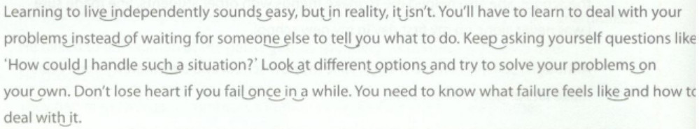 Learning to liveindependently soundseasy, butin reality, itisn’t. You’ll have to learn to deal with your probleminsteadof waiting for someoneelse to tellyou what to do. Keepasking yourself questions like, ‘How couldI handle sucha situation?’ Lookat differentoptionsand try to solve your problemson yourown. Don’t lose heart if you failonceina while. You need to know what failure feels likeand how to deal withit.