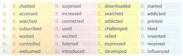 (Đọc tất cả các động từ, chú ý đến cách phát âm của -ed. Khoanh tròn chữ cái của từ khác biệt)