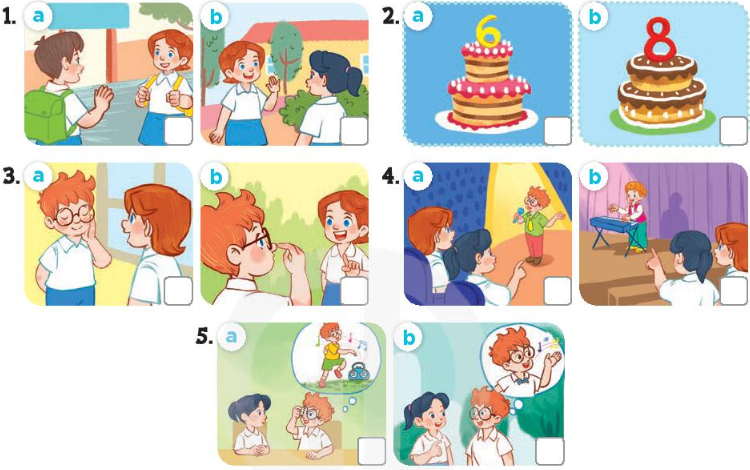 1. Listen and tick. 2. Listen and number. 3. Read and match. 4. Read and complete. 5. Ask and answer.