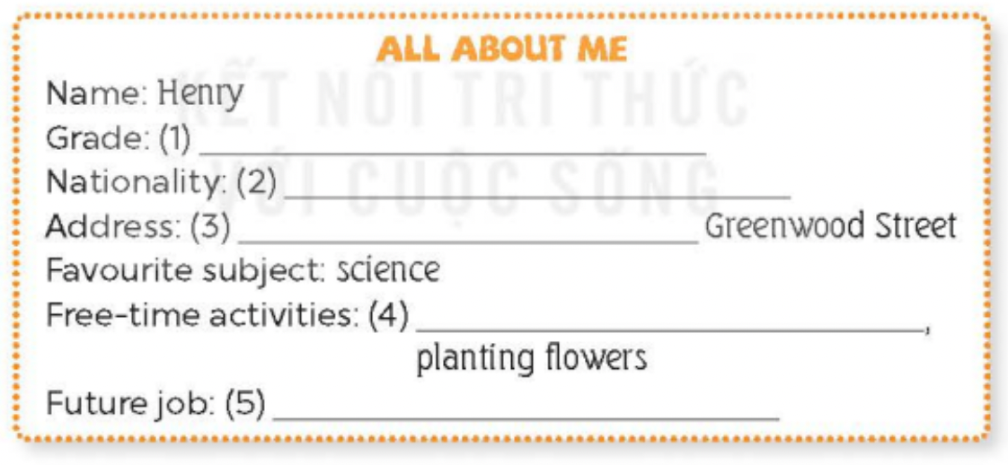 Tôi tên là Henry. Tôi là người Úc. Tôi sống trong một thị trấn nhỏ. Địa chỉ của tôi là 72 đường Greenwood. Tôi nghĩ thị trấn của tôi thật tuyệt vời. Nó luôn sạch và đẹp. Mọi người rất thân thiện và hữu ích. Em là học sinh lớp 5 trường tiểu học Superstar. Môn học yêu thích của tôi ở trường là khoa học. Tôi có điểm khá tốt trong các bài học khoa học. Khi rảnh rỗi, tôi thích lướt Internet và trồng hoa. Ước mơ của tôi trong tương lai là trở thành bác sĩ.