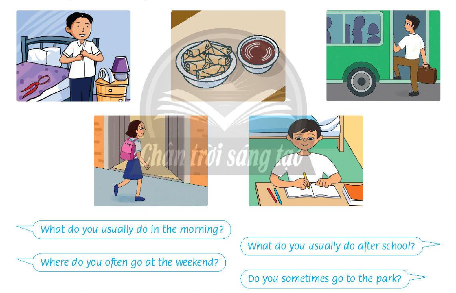 Listen and match the children to the food and drink. There is one extra. Read about Mai’s trip to the supermarket. Write 2 words for each answer. Circle the odd one out. Describe your routines.What do you and your family usually do in the evening? Write a paragraph of 30 – 40 words.