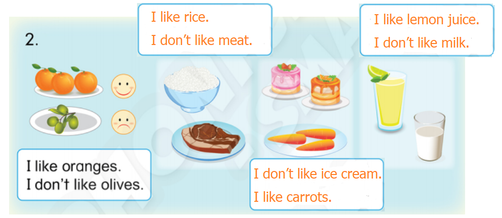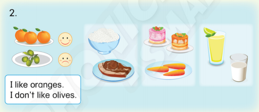 (Tôi thích quả cam./ Tôi không thích quả ô liu.)