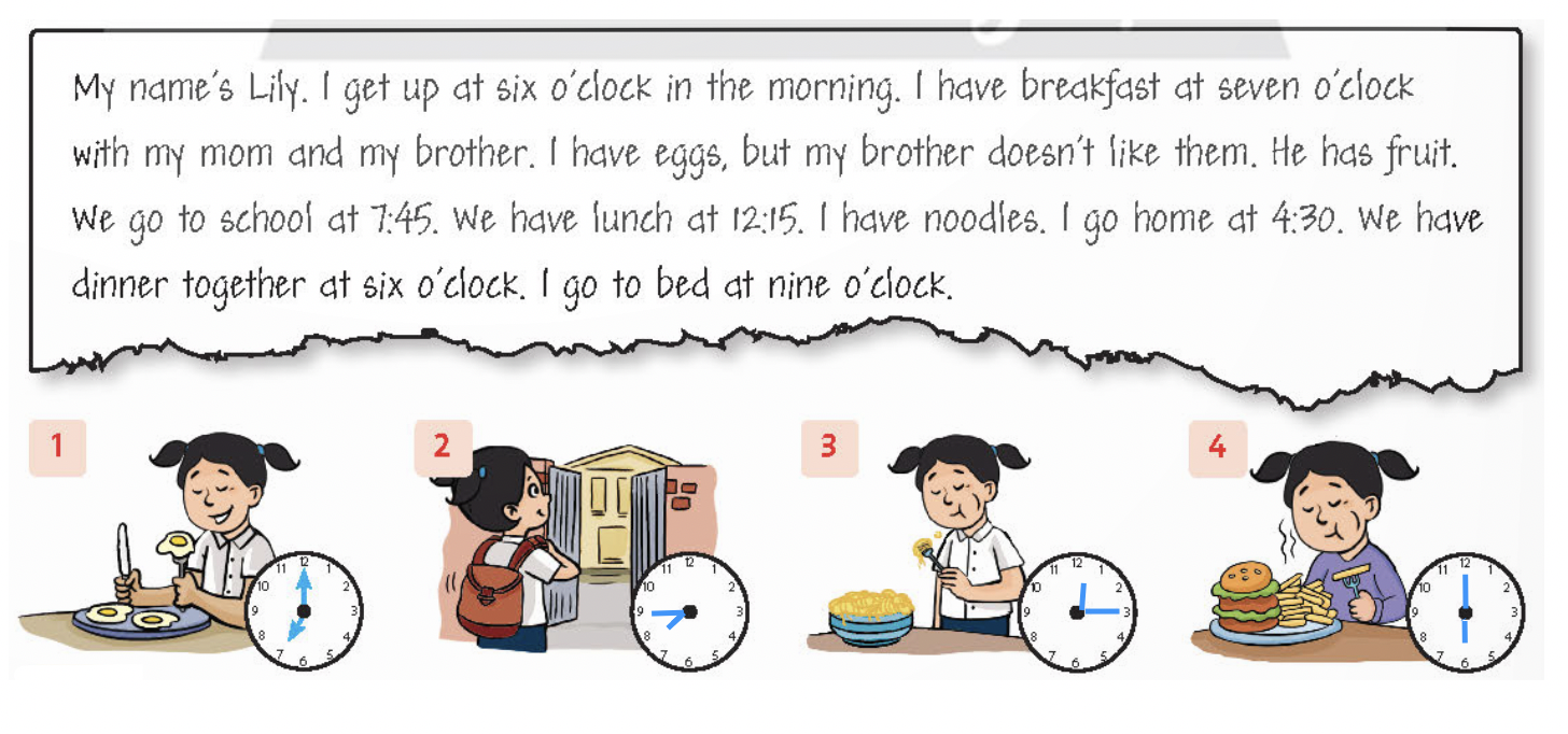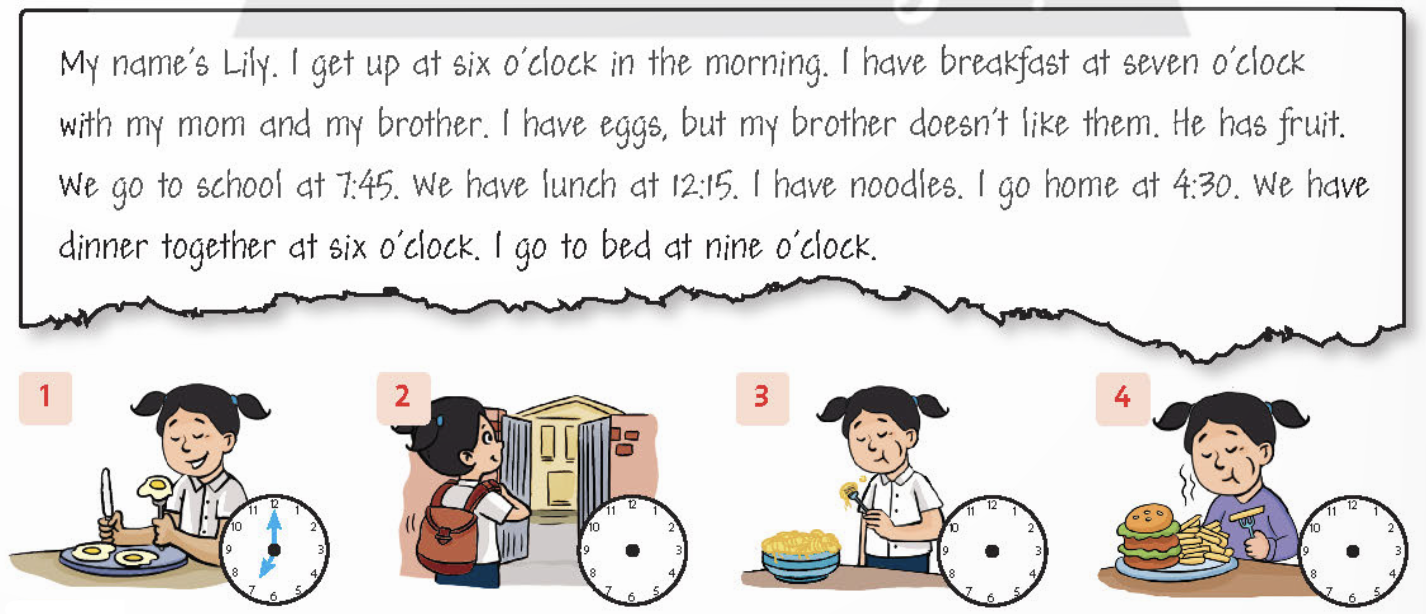 My name’s Lily. I get up at six o’clock in the morning. I have breakfast at seven o’clock with my mom and my brother. I have eggs, but my brother doesn’t like them. He has fruit. We go to school at 7:45. We have lunch at 12:15. I have noodles. I go home at 4.30. We have dinner together at six o’clock. I go to bed at nine o’clock.