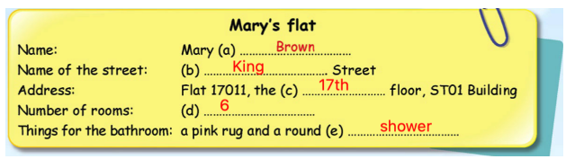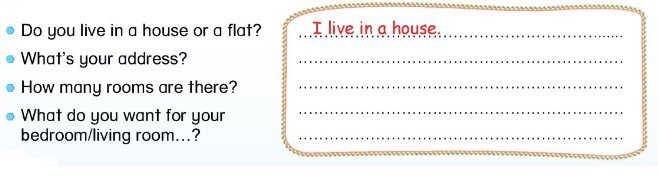 (Tôi sống trong một căn hộ. Nó nằm trong khu dân cư Flower, ở số 38 đường Spring. Có 4 phòng trong căn hộ của tôi. Tôi muốn căn phòng ngủ của mình màu trắng và be. Tôi muốn một chiếc giường, một chiếc thảm, một cái tủ quần áo và một cái cửa sổ thật lớn trong  phòng ngủ của mình.)