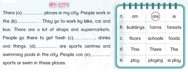 Có rất nhiều địa điểm ở trong thành phố của tớ. Mọi người làm việc trong toà nhà. Họ đi làm bằng xe đạp, ô tô và xe buýt. Có rất nhiều cửa hàng và siêu thị. Mọi người đến đó để mua thức ăn tươi, nước uống và các đồ dùng. Có nhiều trung tâm thể thao và bể bơi trong thành phố. Mọi người có thể chơi thể thao hoặc bơi ở những địa điểm đó.