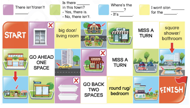 Cách chơi: Các bạn lắc xúc xắc để lấy số, số lắc được trên xúc xắc tuơng ứng với số bước được đi trong bảng. Trong quá trình di chuyển các bạn dừng tại ô màu nào thì hỏi và trả lời theo mẫu câu tương ứng với màu đó, các mẫu câu phải miêu tả đúng nội dung của bức hình đó. Ai đi đến ô Finish trước là người thắng cuộc.