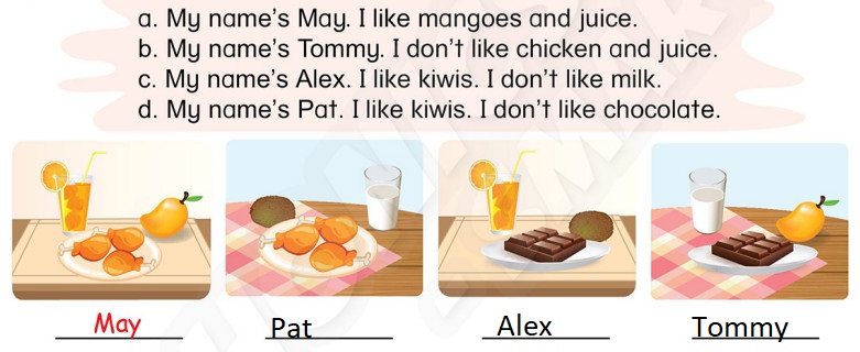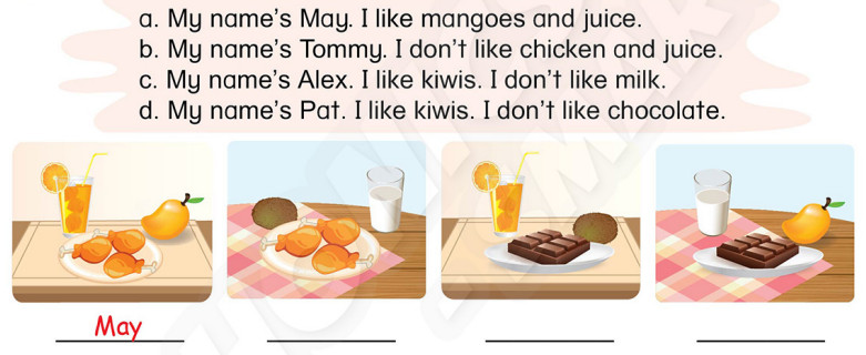 (Tên của tôi là May. Tôi thích xoài và nước ép.)