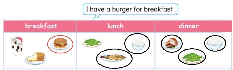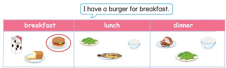 (Tôi ăn bánh ham-bơ-gơ vào bữa sáng.)