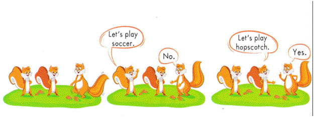 Các bạn còn lại sẽ đoán và nói, ví dụ “Let’s play soccer”(Hãy chơi đá bóng nào), hoặc“Let’s play hopscotch” (Hãy chơi đá bóng nào). Nếu đúng thì nói “Yes”, sai nói “No”.