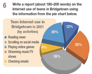 6. Write a report (about 180-200 words) on the Internet use of teens in Bridgetown using the information from the pie chart below.