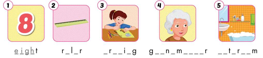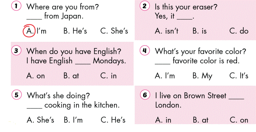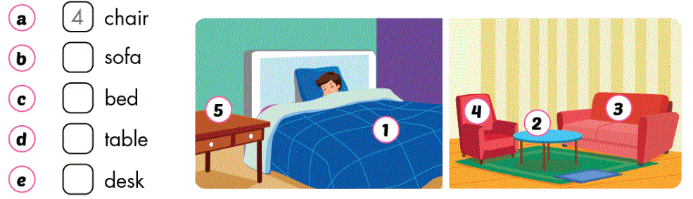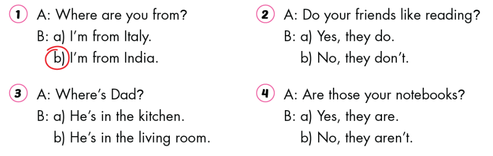 Vocabulary 1.Look and number. 2. Complete the words. Grammar 3. Read and circle. Communication 4. Read and match. Listening 5. Listen and circle. Reading and writing 6. Look, read, and fill the blanks.