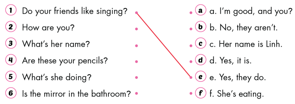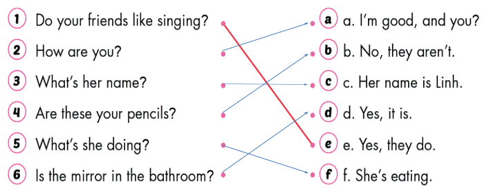 1. Do your friends like singing? (Những người bạn của bạn thích hát phải không?)