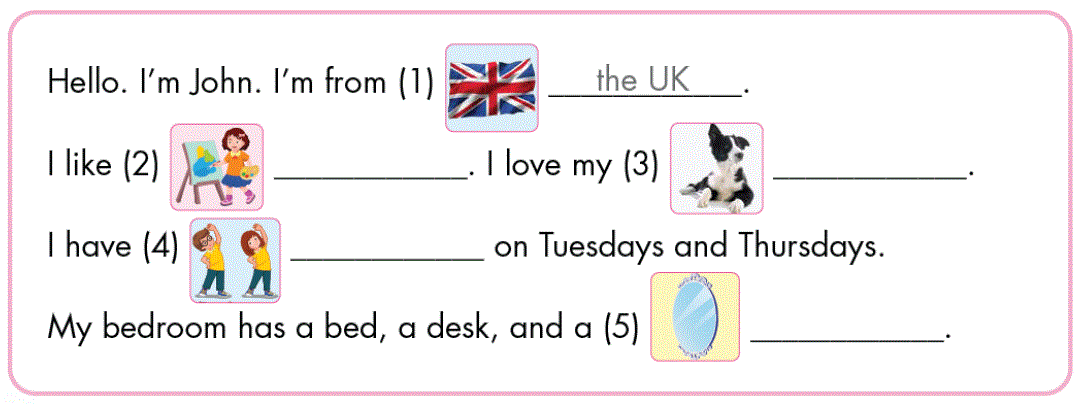 Hello. I’m John. I’m from (1) the UK. I like (2) painting. I love my (3) dog. I have (4) P.E on Tuesdays and Thursday. My bedroom has a bed, a desk, and a (5) mirror.