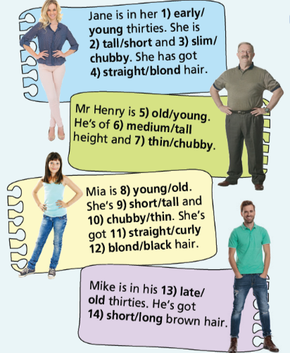 Jane is in her 1) early thirties. She is 2) tall and 3) slim. She has got 4) blond hair.