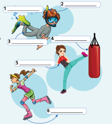 3. Label the pictures with snorkel, boxing gloves, rollerblades, punchbag, flippers and wet suit.