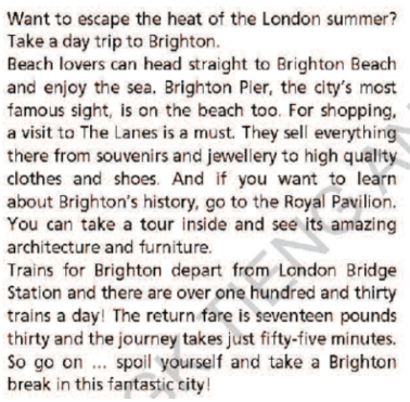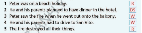 1. Read the text and decide if the statements (1-5) are R (right), W (wrong) or DS (doesn’t say). 2. Read the text again and complete the sentence. 3. Read the text again. For question (1-4), choose the correct answer (A, B or C). 4. Listen to Kelly telling the story of a forest fire. Put picture (A-D) in the order. 5. Listen to an advert and complete the leaflet. 6. Listen to Clara talking to a friend about doing chores on holiday. Match the people (1-5) to the correct chores (a-f). 7. Read the