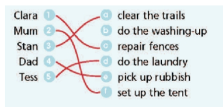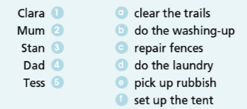 6. Listen to Clara talking to a friend about doing chores on holiday. Match the people (1-5) to the correct chores (a-f)