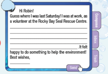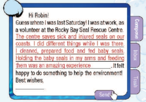 8. Imagine you spent last Saturday volunteering at the Rocky Bay Seal Rescue Centre. Use the information in Exercise 7 to write the main paragraph of your email to your e-friend Robin.