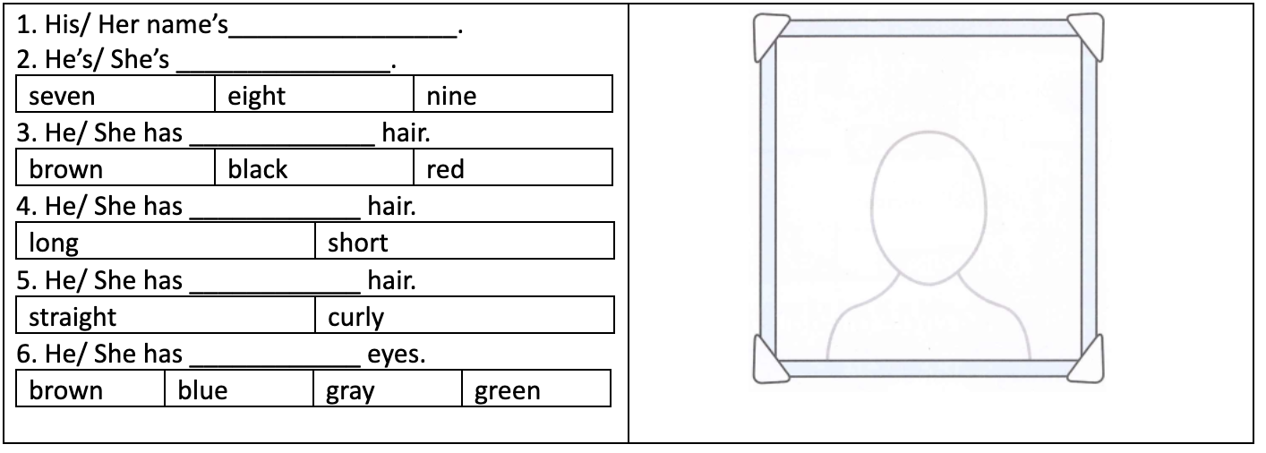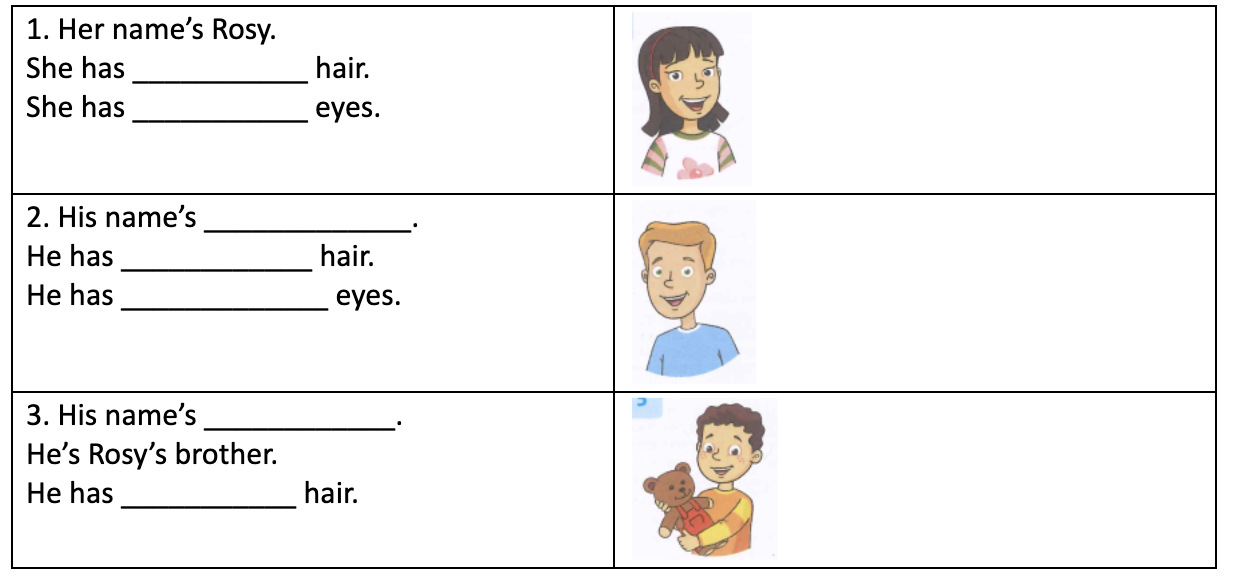 2. Hi. My name’s Leo. I’m eleven. I’m Amy’s brother. I have short hair and blue eyes. My favorite color is green.
