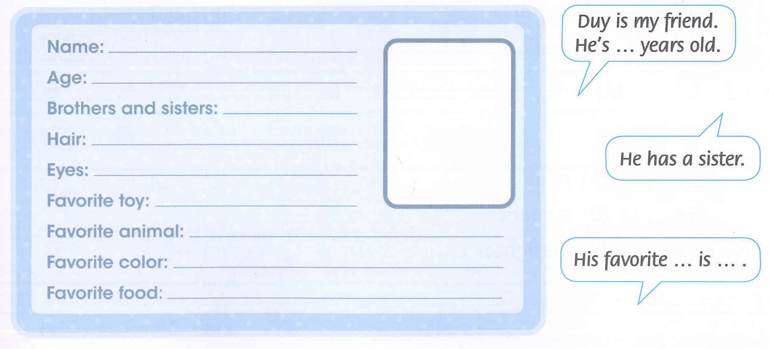 Nguyen Quang Hop is my friend. He’s 9 years old. He doesn’t have any brothers or sisters. He has black hair and brown eyes. His favorite toy is car and his favorite animal is dogs. White is his favortite color. He likes eating fish rice, too.