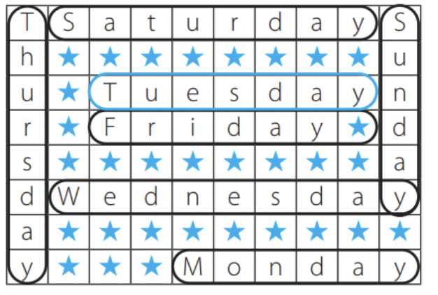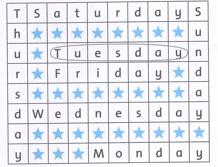 (Tìm và khoanh tròn các thứ trong tuần.)