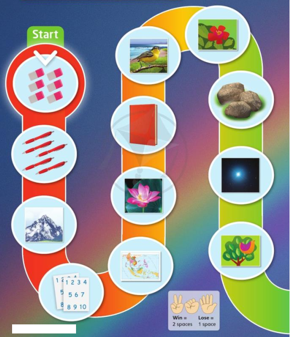 Cách chơi: Chơi “kéo, búa, bao”, ai thắng sẽ đi được 2 bước, ai thua đi 1 bước. Dừng ở ô nào thì nhìn vào ô người đang đứng, một bạn hỏi và một bạn trả lời.