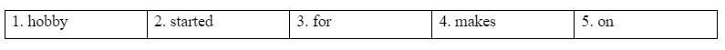 Thanks for your email. Now I tell you about my favourite (1) _______. I have some hobbies, but my favourite is making greeting cards. I (2) _______ this hobby two years ago. Now I can make different kinds of cards (3) _______ my family, teachers, and friends. It’s an easy hobby. I just need some coloured paper, coloured pencils, and some glue. Making cards (4) _______ me more patient