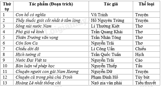 Ghi lại tên tác phẩm, tác giả, thể loại của tác phẩm (hoặc đoạn trích) văn học Việt Nam trung đại, được học và đọc thêm trong sách giáo khoa Ngữ văn THCS theo hai bộ phận văn học chữ Hán và chữ Nôm.