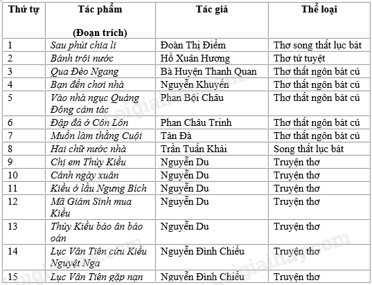 – Thời trung đại (thế kì X – XIX): Sông núi nước Nam, Phò giá về Kinh, Bình Ngô đại cáo, Hịch tướng sĩ, Thuật hoài…