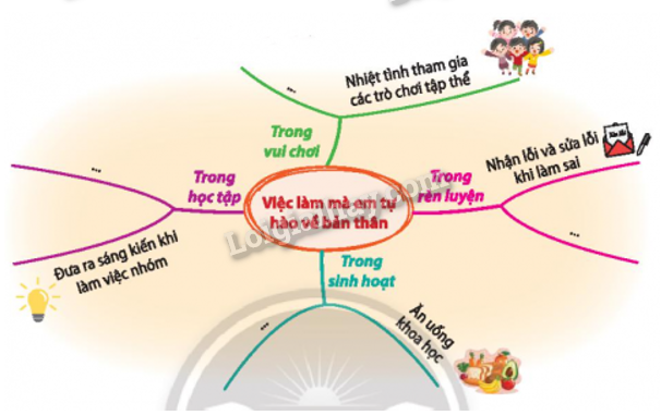Liệt kê những việc làm mà em tự hào về bản thân từ đó dựa vào gợi ý lập sơ đồ tư duy và chia sẻ trước lớp về việc đó.