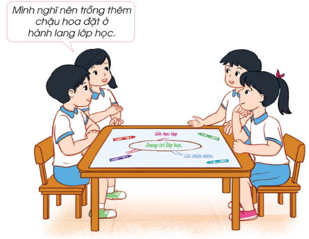 – Em thảo luận với các bạn về ý tưởng trang trí lớp và chia sẻ trước lớp.