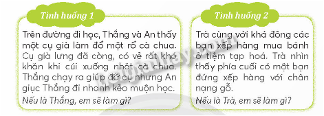 – Tình huống 1: Nếu em là Thắng, em vẫn sẽ giúp đỡ cụ bà nhặt cà chua mặc dù đã muộn học. Khi đi đến lớp, em sẽ nói chuyện và giải thích với An rằng lúc đó cụ già cần giúp đỡ, mình giúp cụ sẽ nhanh chóng hơn tránh cho việc cà chua lăn lung tung đi sẽ xa hơn sẽ không nhặt được và gây nguy hiểm cho người qua đường. Nếu bị phạt khi đi học muộn, hai bạn sẽ trình bày lí do và chắn chắn sẽ được cô giáo thông cảm.