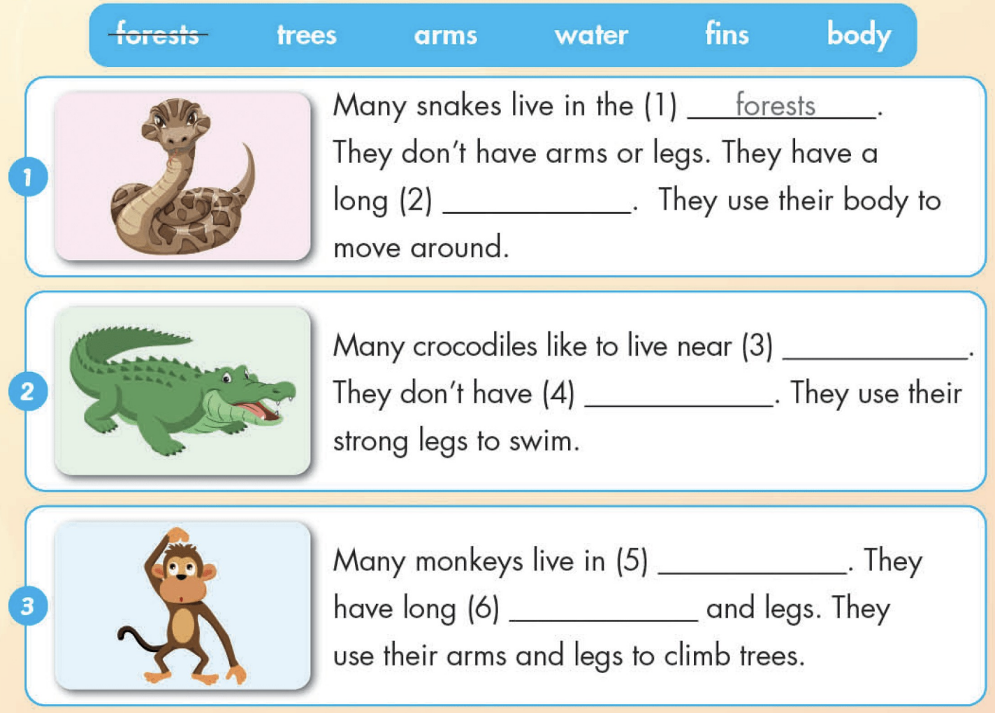Many crocodiles like to live near water. They don’t have fins. They use their strong legs to swim.