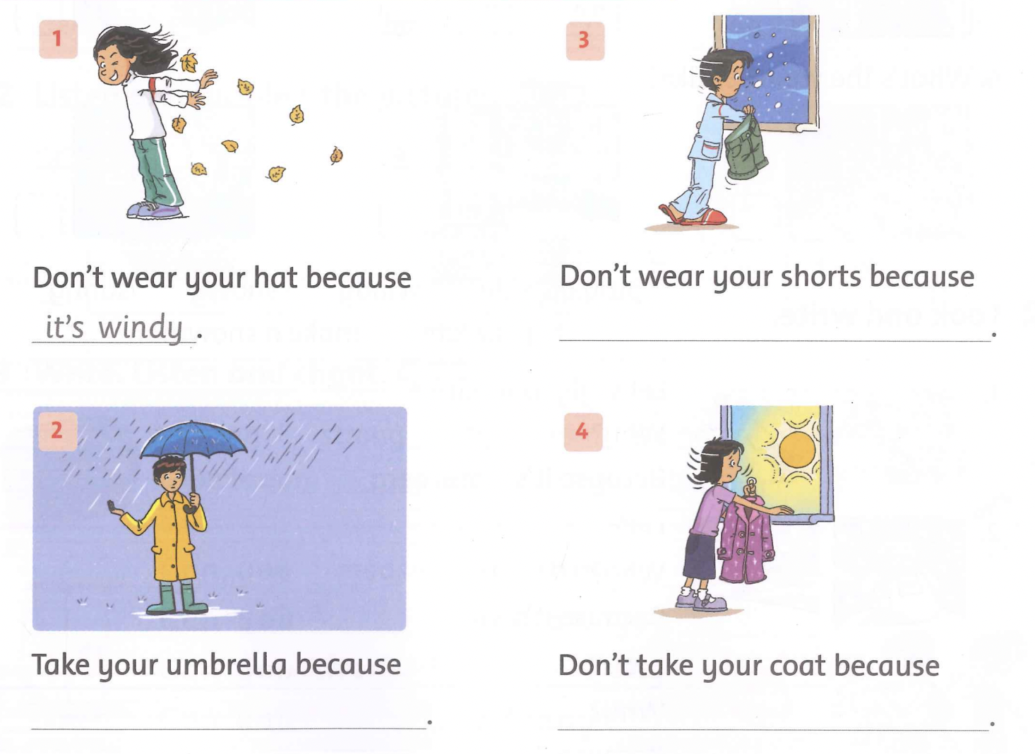 It’s home time. Put on your raincoat and take your umbrella because it’s rainy and cold. Don’t wear your hat because it might fly away!