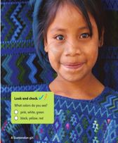 Look and check. What colors do you see? pink, white, green. black, yellow, red