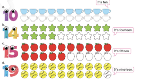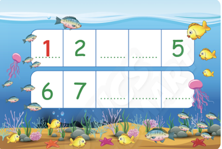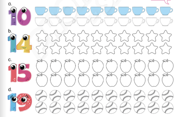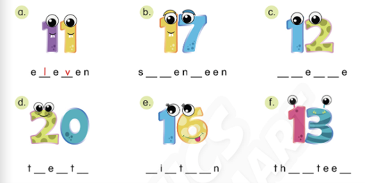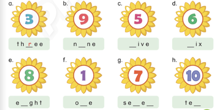 Match and say. Listen and write. Listen and follow. Draw and write. Write the missing numbers and say. Complete the words. Write the missing letters. Say the numbers. Count and colour. Read and write. Match and colour. Read and colour.