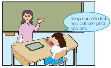 Đặt đồ vật và nói về vị trí đồ vật đó theo mẫu.