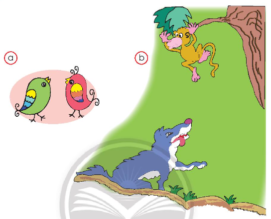 b) Con khỉ ở trên cành cây, con chó sói ở bên dưới