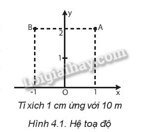 – Nếu tỉ lệ là \(\frac{1}{{1000}}\) thì vị trí của điểm A trong Hình 4.1 được xác định trên hệ tọa độ là A (x = 10 m; y = 20 m) và của điểm B là B (x = -10 m; y = 20 m).