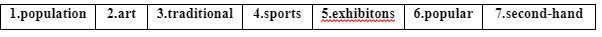 (Điền vào chỗ trống với second – hand, exhibitions, art, traditional, population, popular hoặc sports.)