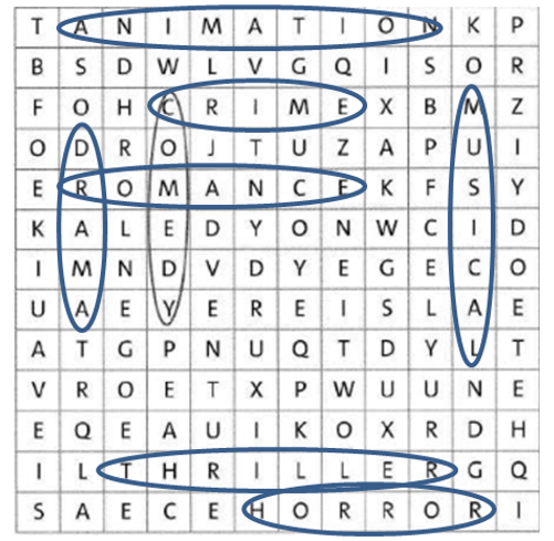1 Find eight more film and book genre words in the wordsearch.2 Match the plot with a film and / or book genre. 3 Choose three film and book genres that each person would like. There are two genres you don't need.