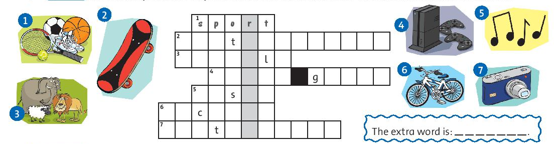 1. Look at the pictures. Complete the crossword with hobbies and interests. Find the extra word.