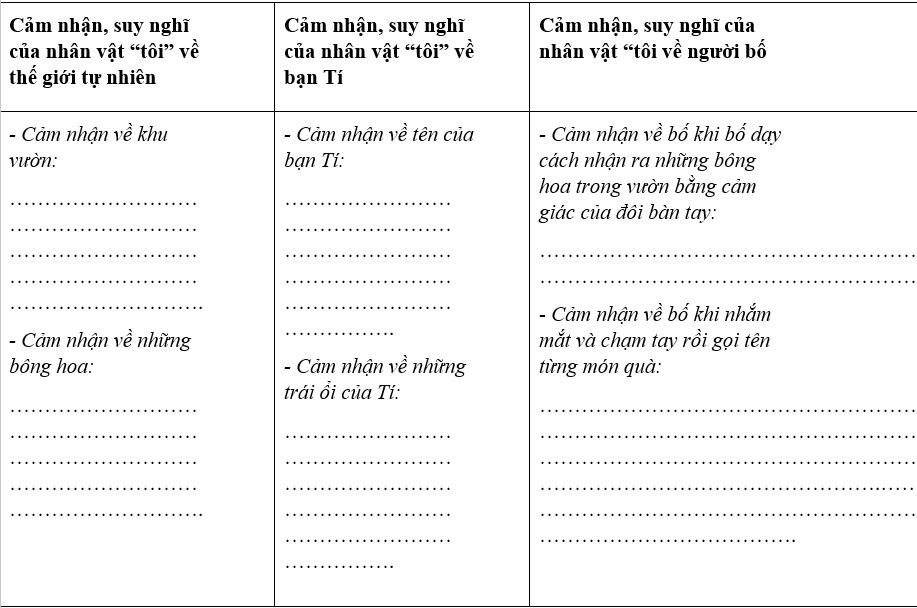 Từ bảng trên, ghi lại nhận xét của em về đặc điểm tính cách của nhân vật “tôi”: – Liệt kê những chi tiết tiêu biểu miêu tả cảm xúc, suy nghĩ của nhân vật “tôi” về bố và bạn Tí: