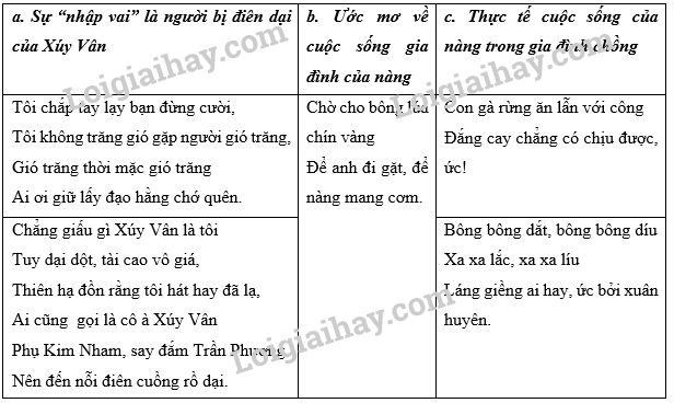 → Ở cuối đoạn trích, tâm trạng của Xúy Vân rơi vào trạng thái hỗn loạn, điên dại, rối bời, mất phương hướng”. Những câu nói ngược, đầy những phi lí, nghịch dị khơ gợi về một thực trạng nội tâm xáo trộn, bất ổn, đầy trớ trêu. Nhân vật dường như rơi vào trạng thái hỗn loạn, điên dại, rối bờ, mất phương hướng.