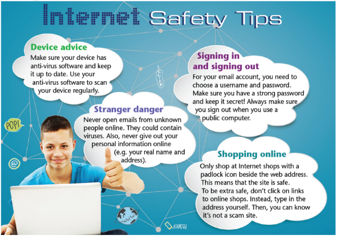4. What did you know about Internet safety? What did you learn from the text? How can these tips help you? Write a few sentences in your notebook. Tell your partner.
