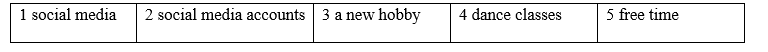 1 Fill in each gap with lessons, homework, exams, school trips or presentations. 2 Fill in each gap with play, surf, watch, go or read. 3 Choose the correct options. 4 Choose the correct options. 5 Choose the correct options. 6 Choose the word whose underlined part is pronounced differently from the others. 7 Listen to a dialogue about a teenager's problem. Decide if the statements (1-5) are R (right) or W (wrong).