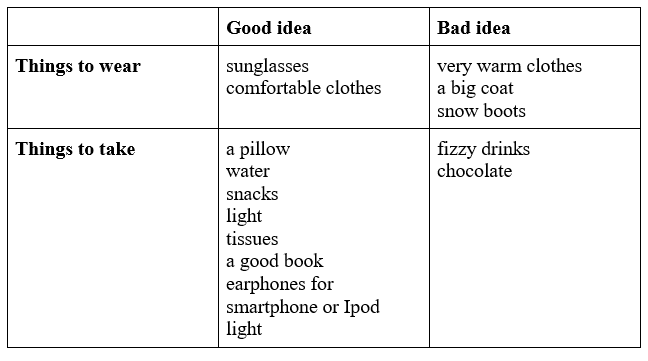 5. Discuss which ideas below are good and which are bad for a very long bus journey. Give reasons. Then complete the table.