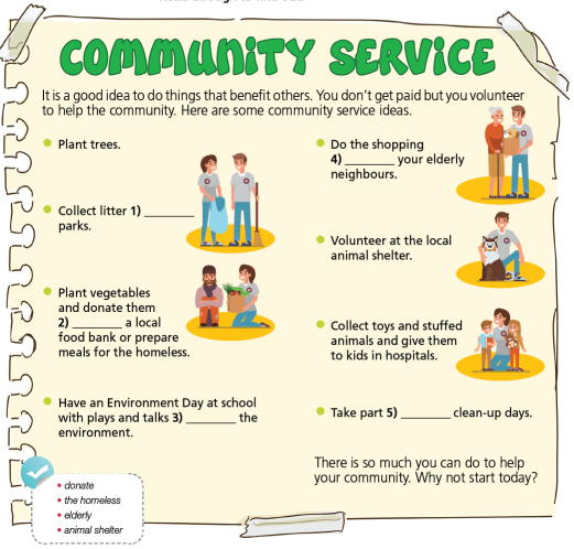 4. Decide on some community service activities. Present your ideas to the class. Then, the class decides on the best ten ones.