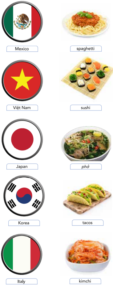 1 Match the food to the country of origin. 2. Listen to a talk about Phở, a famous dish in Việt Nam. Then read aloud. Pay attention to the underlined words or phrases. 3 Work in groups. Prepare a talk about a traditional food in Nam or a country that you know well. Think about: