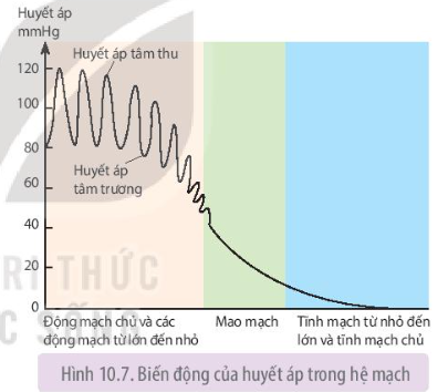 Quan sát Hình 10.7, giải thích sự biến động huyết áp trong hệ thống mạch máu.